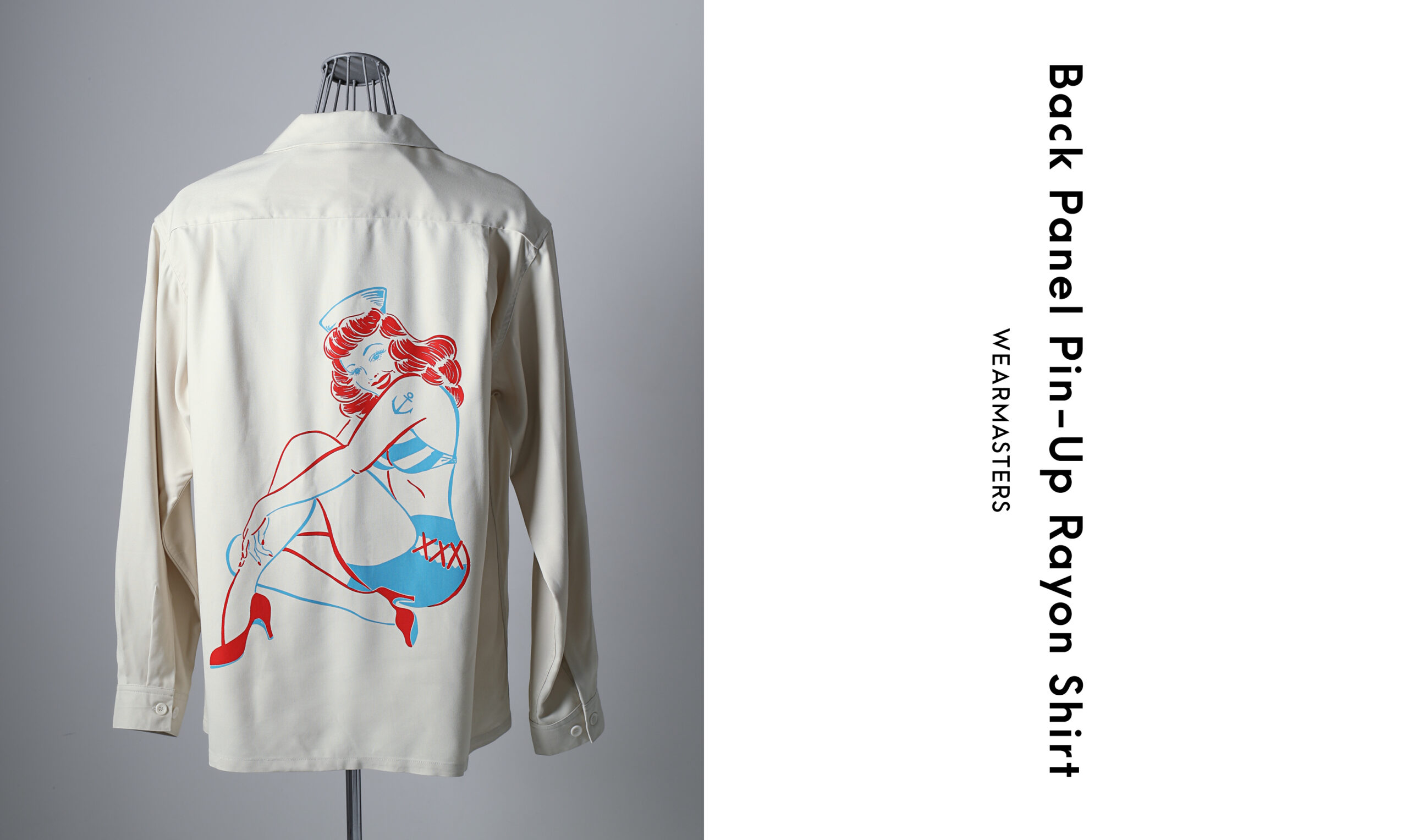 A shirt featuring a bold back panel print with an original pin-up girl by MASA SCULP. Crafted from custom-developed heavyweight rayon oxford with filament and spun yarns, finished with a two-tone print for classic poise. The semi-loose, box-shaped silhouette offers relaxed elegance, detailed with corozo buttons.