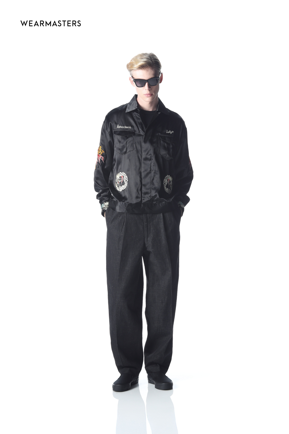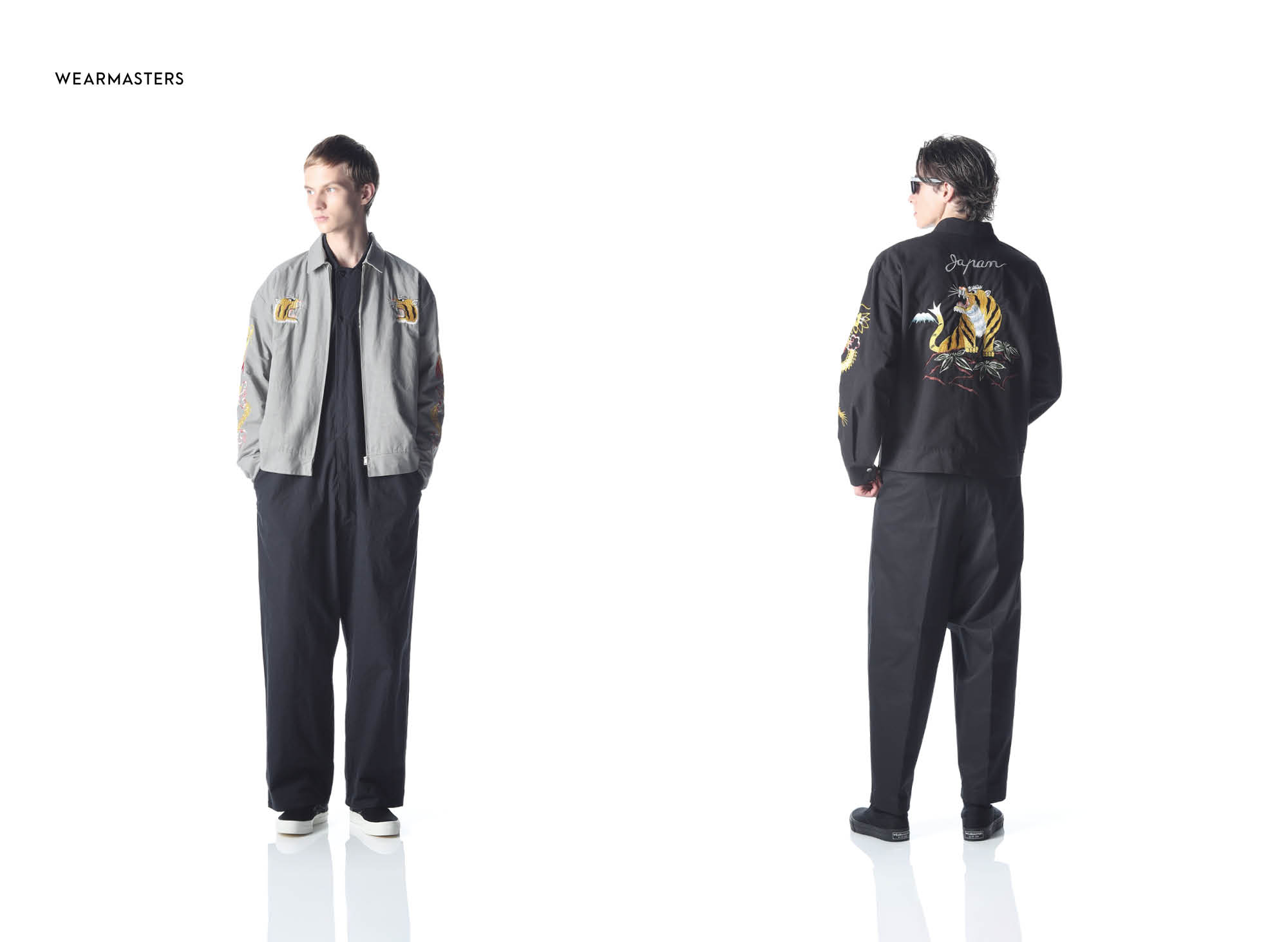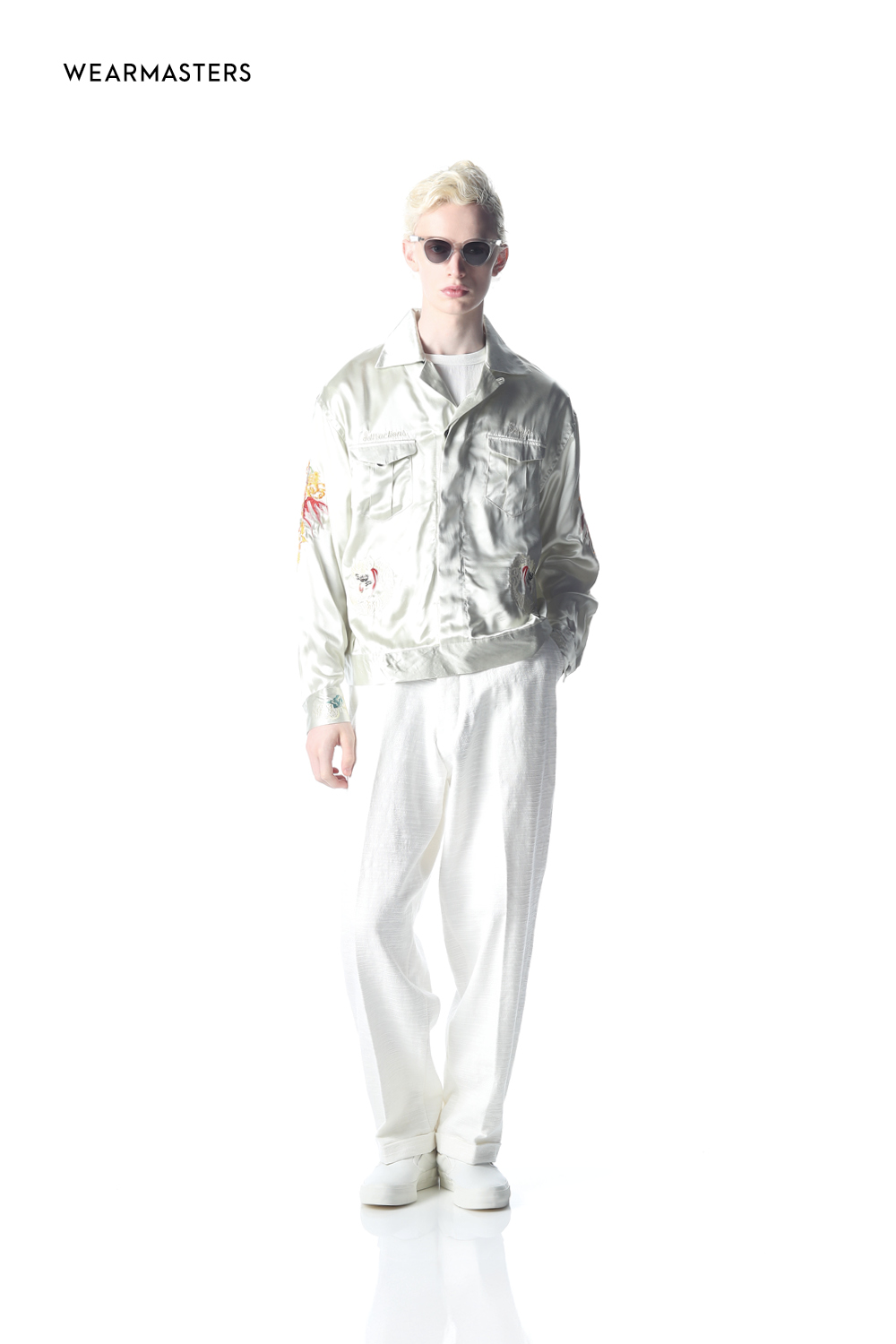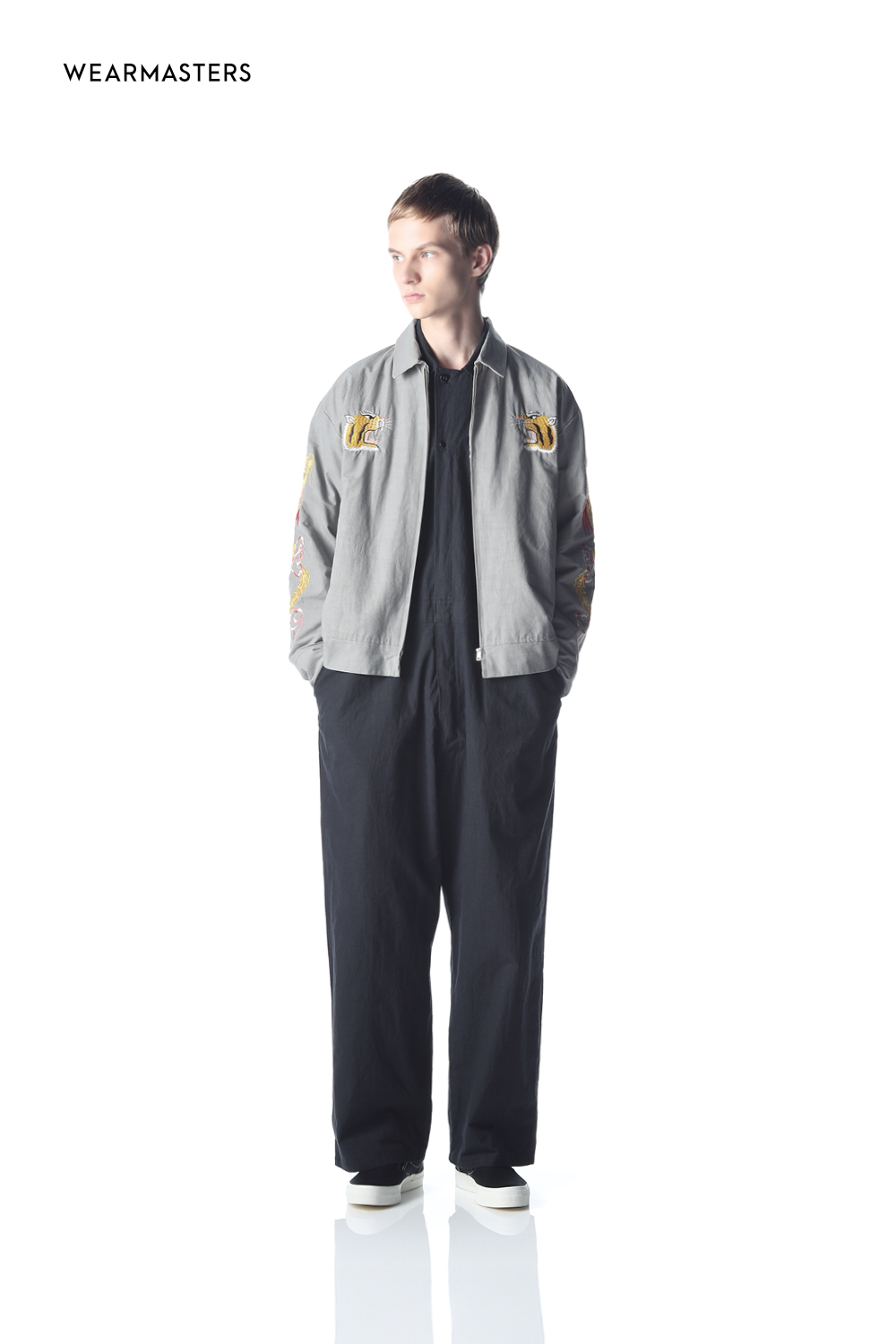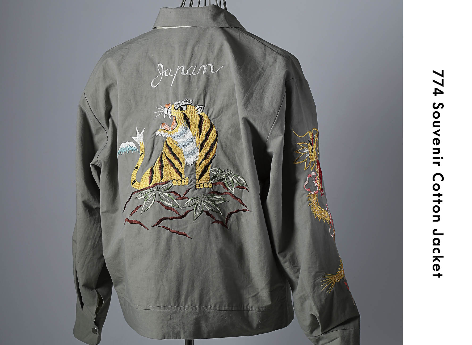 Crafted with hand-guided sewing machine embroidery, this souvenir jacket exudes profound impact. Subtle gradations and multilayered stitching infuse depth into the motif. The body features textured cotton fabric, paired with a lustrous rayon satin lining. A classic, wide, short-length box silhouette captures vintage poise, finished with a straight-slider UNIVERSAL zipper and hammered dot buttons for refined precision.