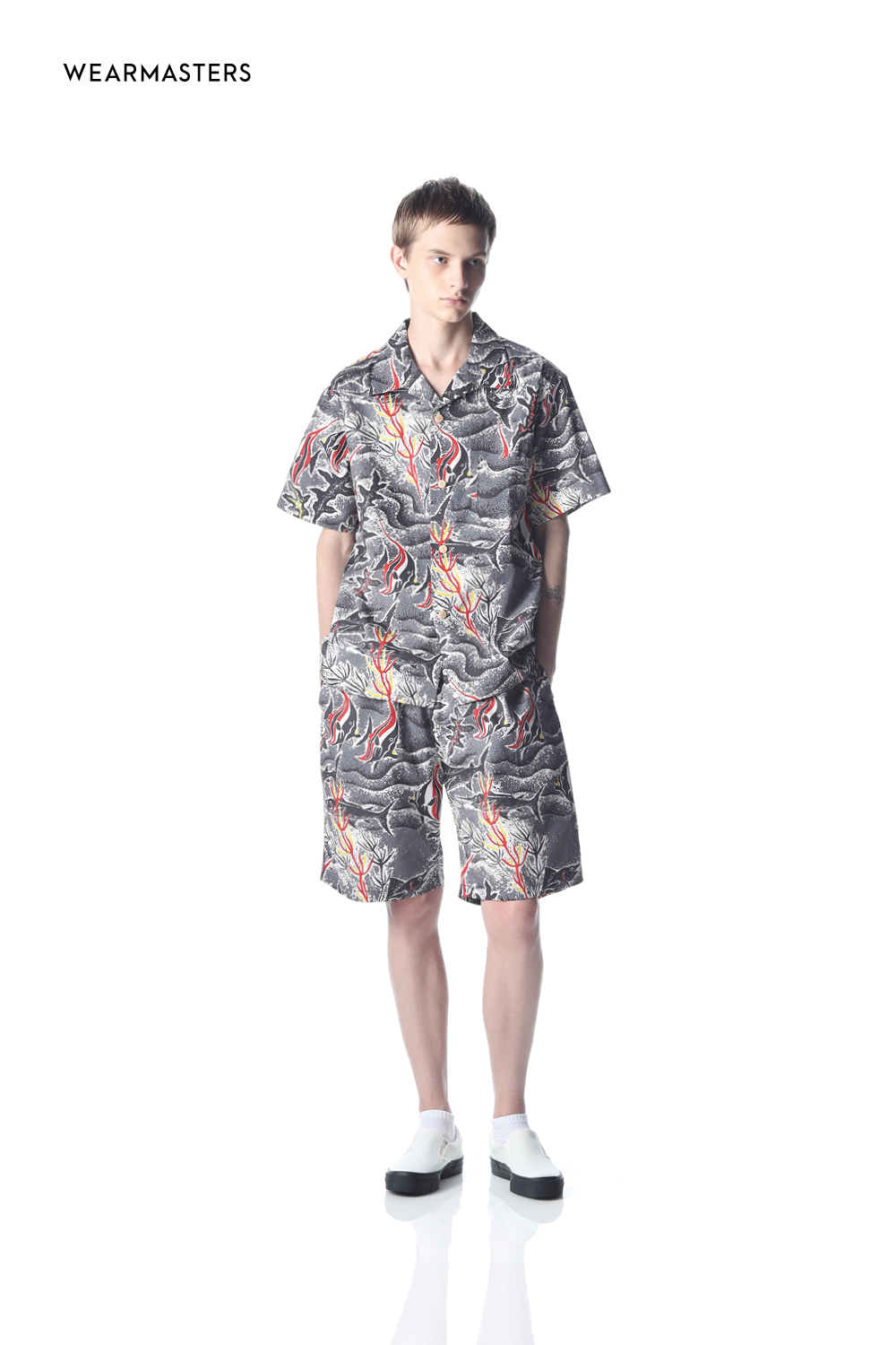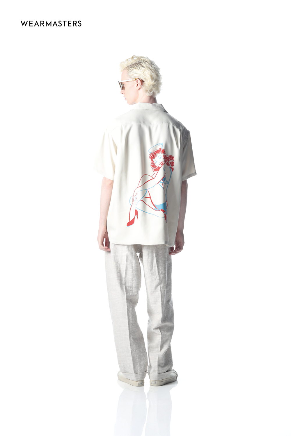 MASA SCULP氏によるオリジナルピンナップガールを大胆に配したバックパネルプリントシャツ。ヴィンテージを再現した独自開発のヘヴィウエイトレーヨンオックスを使用し、バイカラープリントでクラシカルな雰囲気に仕上げた。ナットボタンを使用し、セミルーズフィットのボックスシルエットで、ゆったりとしたエレガンスを表現。